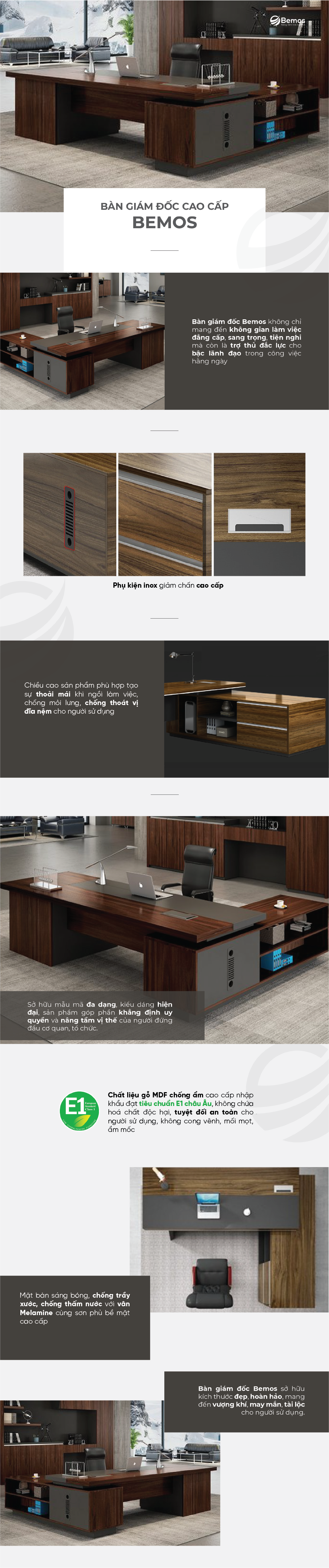 Bàn giám đốc BMG 10039 không chỉ đơn thuần là một sản phẩm nội thất mà còn là biểu tượng của sự tinh tế và đẳng cấp. Với sự kết hợp hài hòa giữa đường nét hiện đại và sự sang trọng, bàn giám đốc này là một điểm nhấn độc đáo trong không gian làm việc. Sự chăm chút đến từng chi tiết, từ cách sắp xếp các ngăn kéo, kệ đựng, đến việc tinh chỉnh tỉ mỉ các đường cong, tạo ra một sản phẩm không chỉ thực tế mà còn thể hiện phong cách và cá tính của người sử dụng. Với sự đa dạng trong thiết kế và tính năng, bàn giám đốc này không chỉ là nơi làm việc đáng ngưỡng mộ mà còn là một tác phẩm nghệ thuật đem lại sự hài lòng tối đa cho mọi khách hàng.